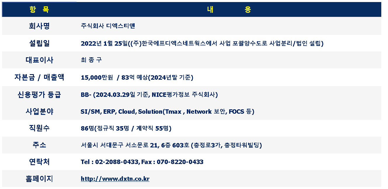 (주)디엑스티앤(DXT&)은 전문인력과 다년간 경험을 바탕으로 공공, 금융 분야 및 일반 기업들을 대상으로 SI,SM,ERP사업의 성공적인 이행을 제공합니다. 또한, 클라우드 산업의 급격한 성장에 따라 선제적 인력 육성 및 사업 경험을 바탕으로 고객 업무에 필요한 최상의 클라우드 시스템 구축 및 운영을 하고 있으며, 네트워크, 보안, 미들웨어 등 고객이 필요로 하는 최상의 솔루션을 제공 합니다.