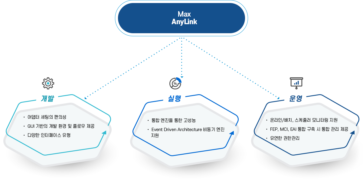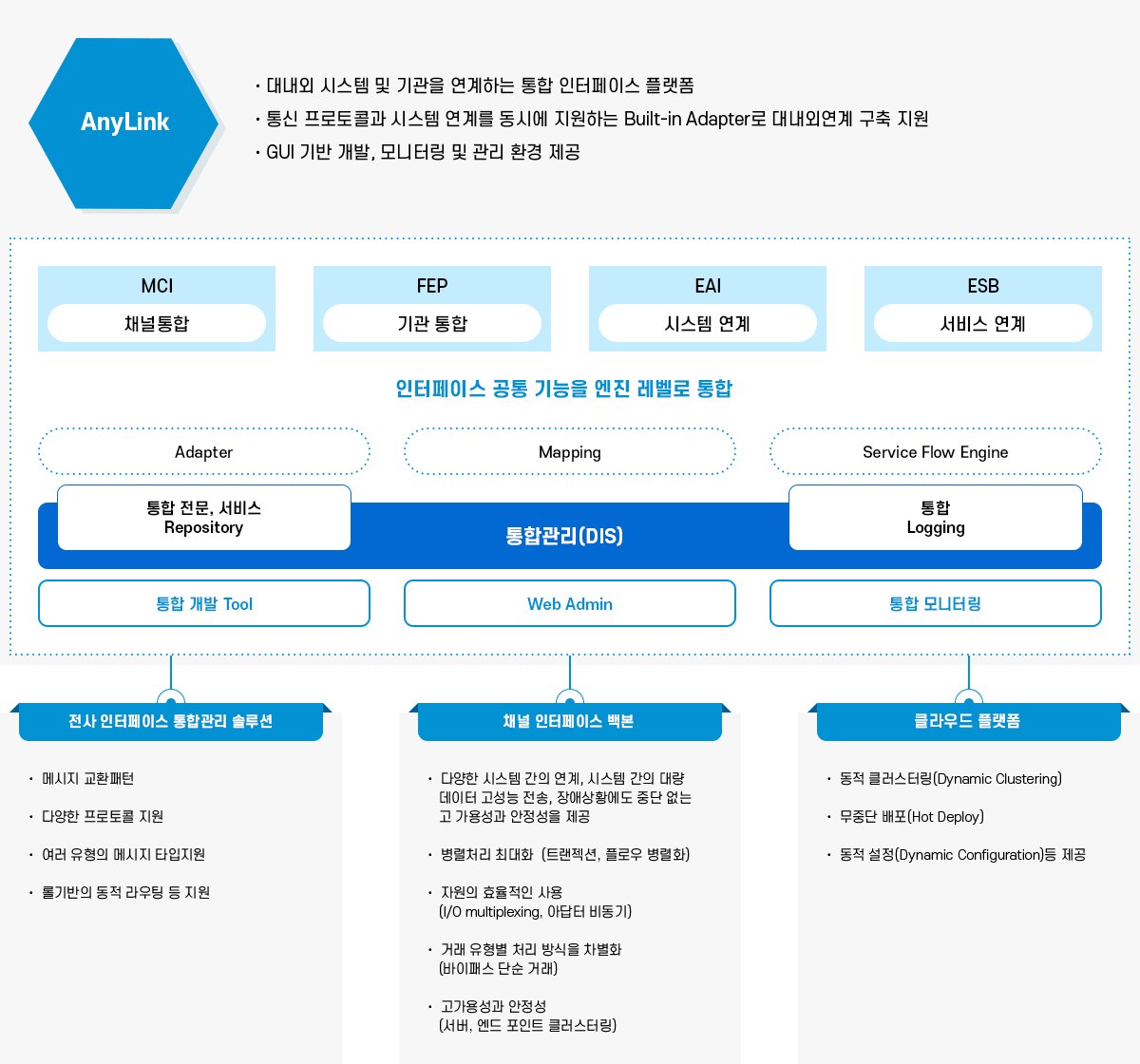 AnyLink는 동적 활장 지원, 클러스터링, Fail-over 기능, 대량 트랜잭션 처리 기능 등을 통해 안정적이고 중단 없는 인터페이스 서비스를 지원하고, 타 서비스에 영향을 주지 않는 설정 변경으로 안정적인 서비스 운영 가능