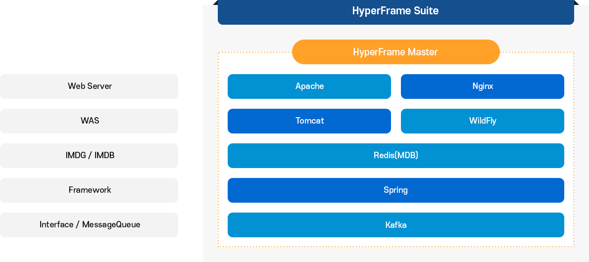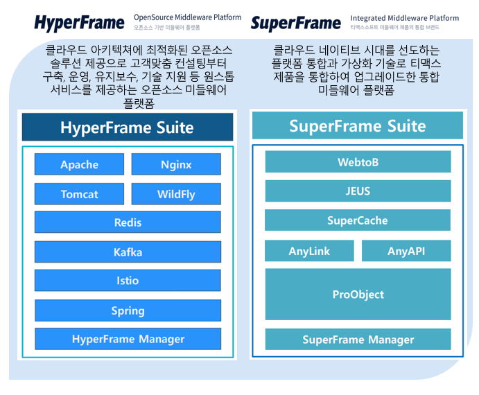20여년 동안 국내 시장점유율 1위를 지켜운 강력한 미들웨어 기술력을 기반으로 WAS, 웹서버, 프레임워크, 메인프레임 모더나이제이션 솔루션 등